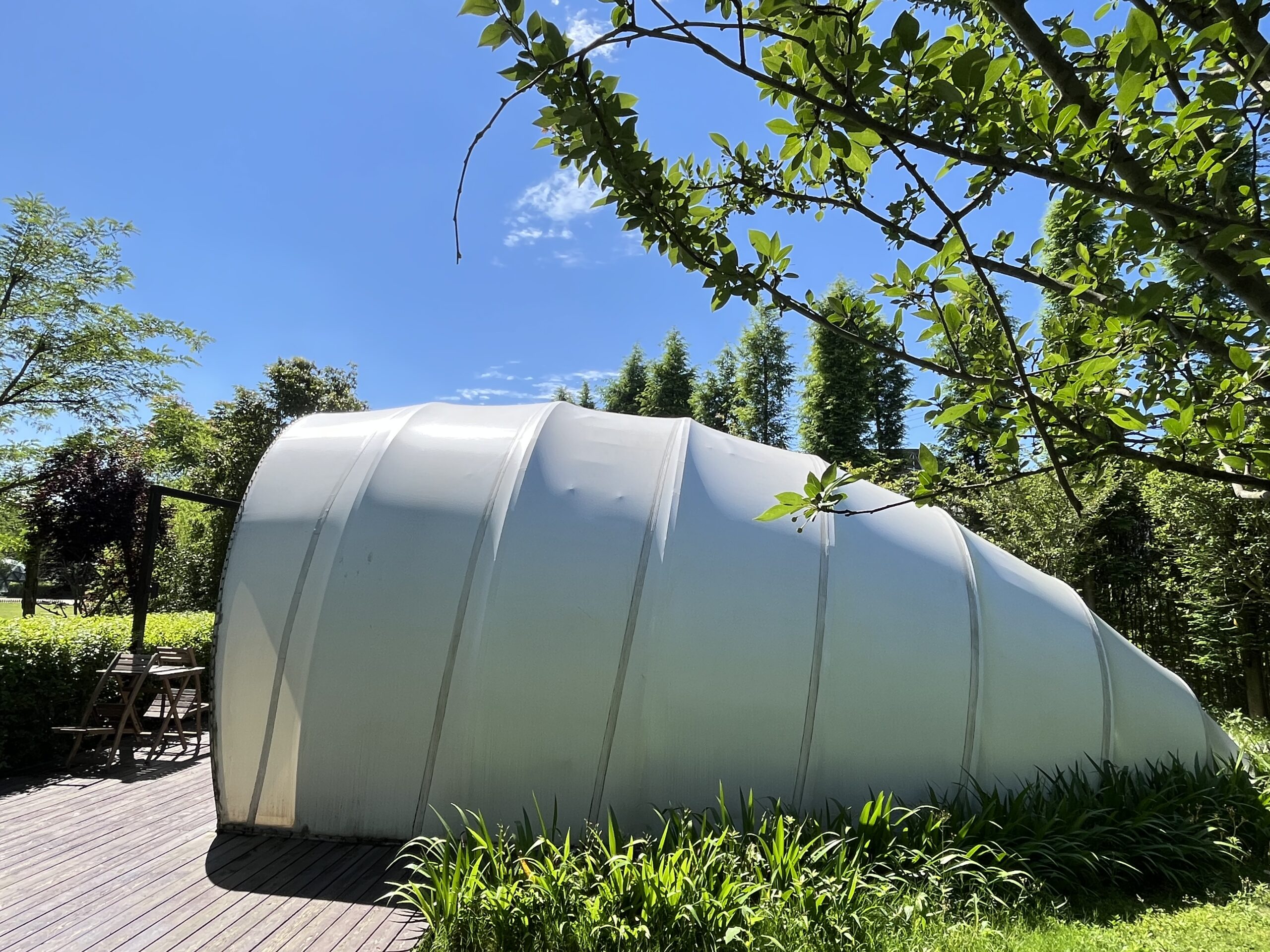 The cocoon tent house stands out as an exceptionally creative glamping option. Its unique design resembles a miniature house, adding a fun and charming element to your camping experience. With its special curved structure and elegant white exterior, this tent seamlessly integrates into natural surroundings, becoming a captivating focal point for lake or seaside glamping.
