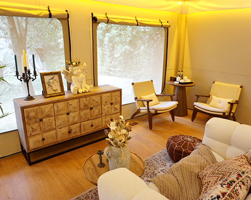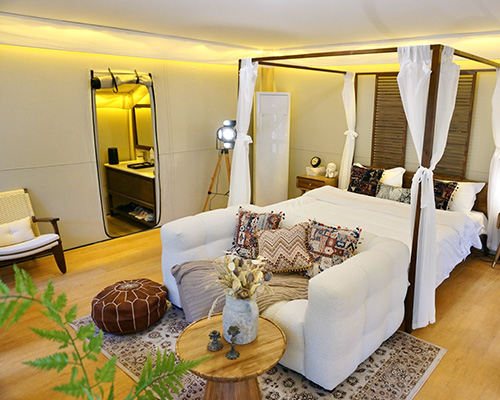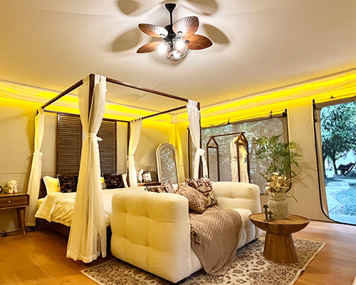 The tent offers a living space of 5m*5m (bedroom) + 2m*3m (bathroom), with a total indoor area of 31 square meters. Its spacious interior allows for the inclusion of a bathroom area and a twin-size mattress, providing ample room for luxurious comfort. This tent structure embodies glamping ideals by combining comfort and style in its interior design.