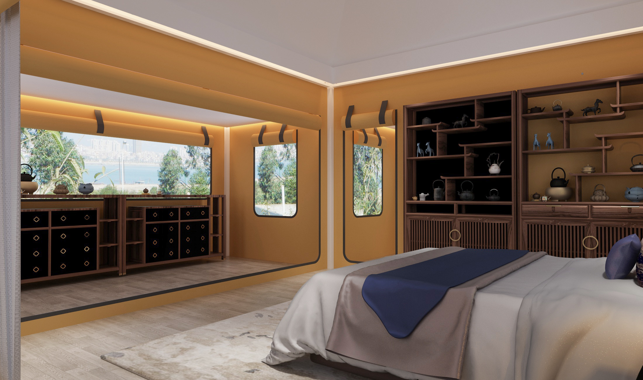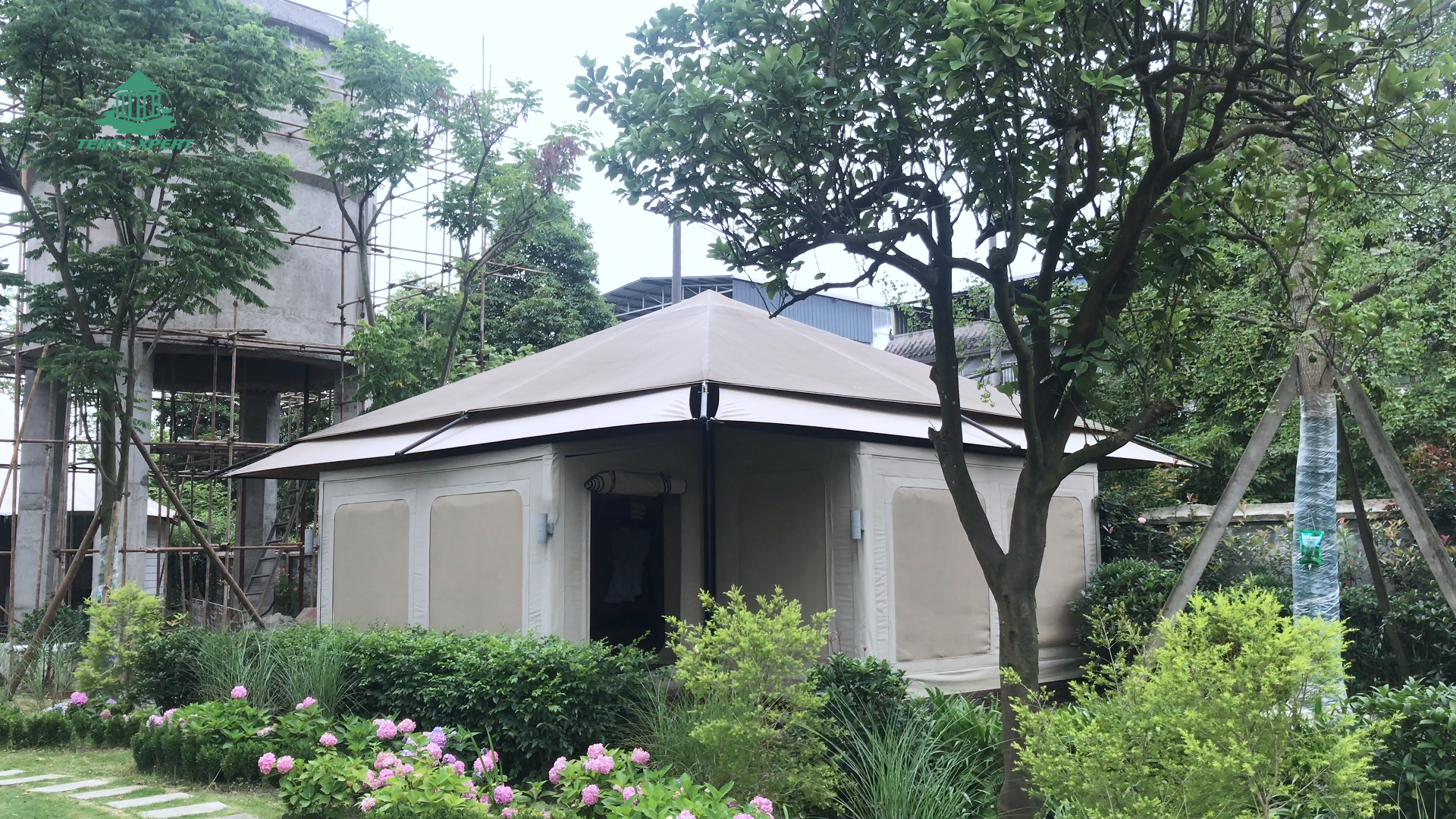 Crafted with meticulous attention to detail, our luxury glamping tent showcases an enchanting aesthetic. Spanning an expansive 55 square meters, this exquisite dwelling comfortably hosts two individuals, offering lavish living areas comprising bedrooms, bathrooms, and outdoor patios. Its premium design seamlessly harmonizes with diverse surroundings, whether enriching upscale resorts worldwide or delivering five-star tent experiences in remote destinations, guaranteeing unparalleled comfort and an intimate ambiance.