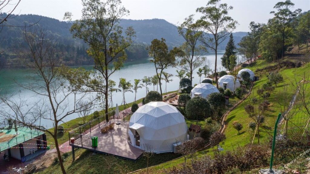 The PVC dome tent combines elegance with exceptional durability, boasting straightforward assembly and swift installation. What’s more, these semi-permanent fixtures typically bypass the need for building permits and can be situated in virtually any location! Experience the delight of self-contained glamorous camping throughout all seasons.
